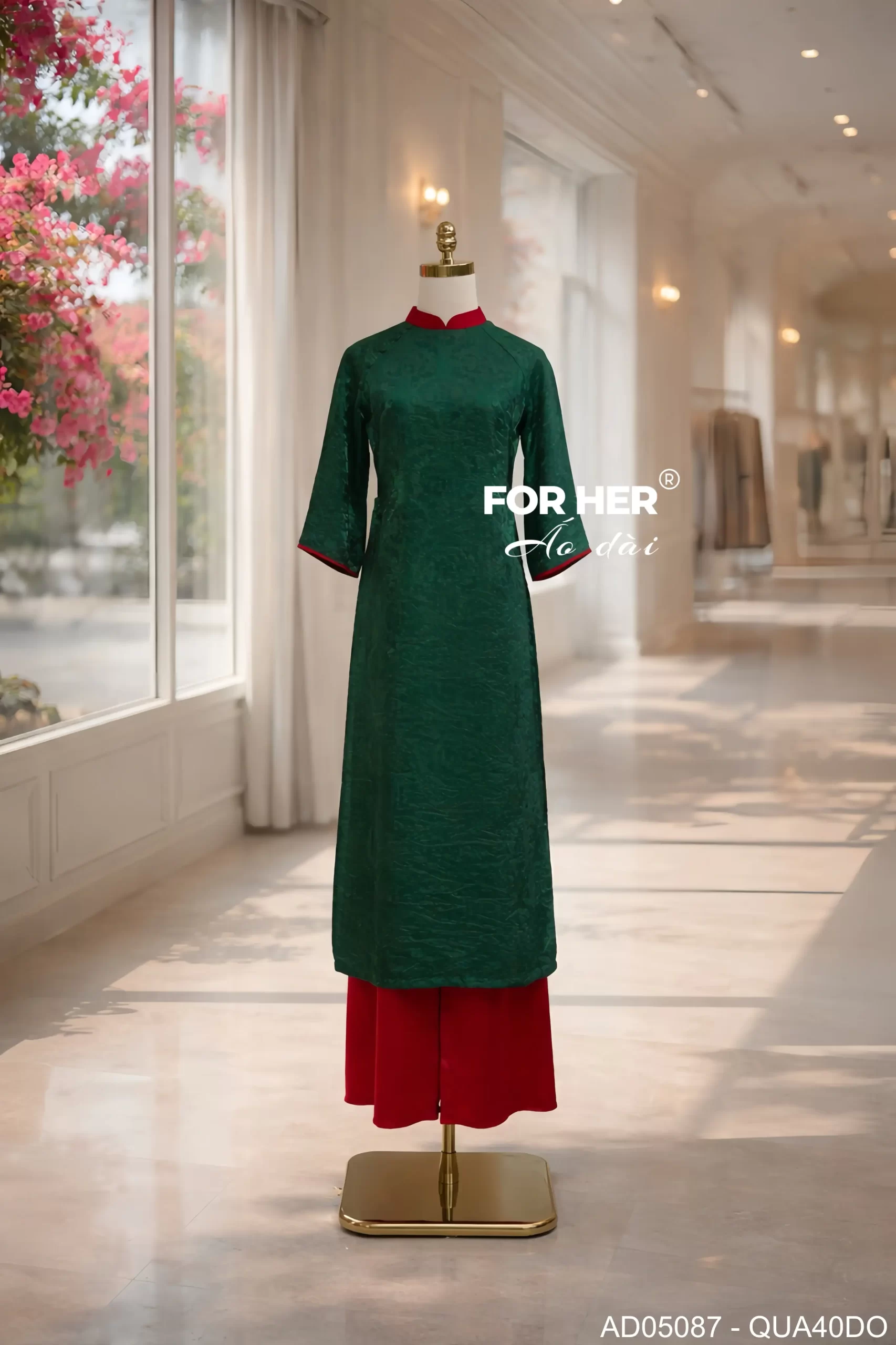 Áo dài Ánh Xuân tơ ánh xanh lá AD05087