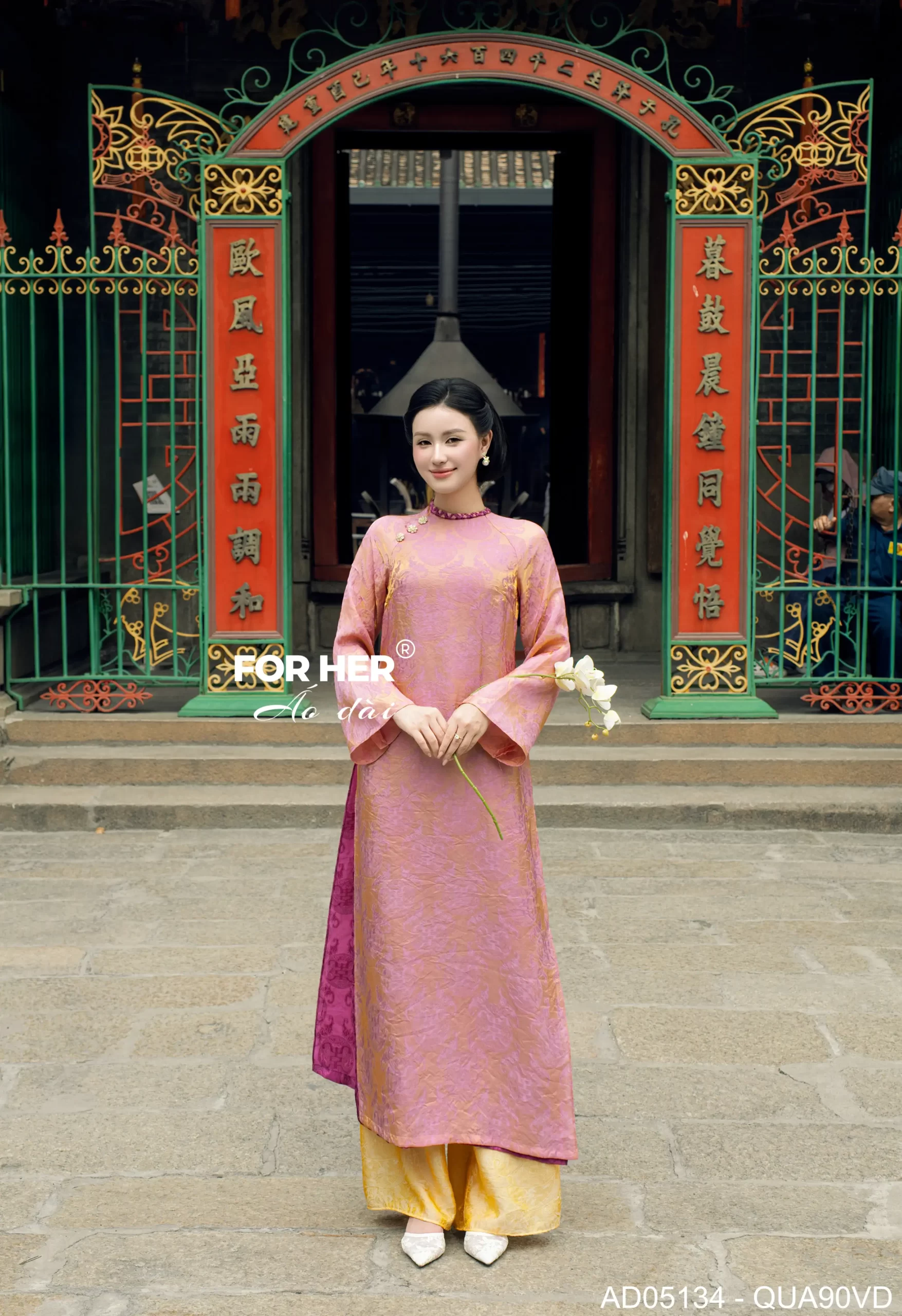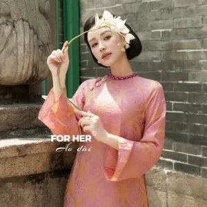 Áo dài Diễm Xuân 4 tà nút hoa mai kem AD05134