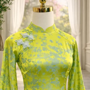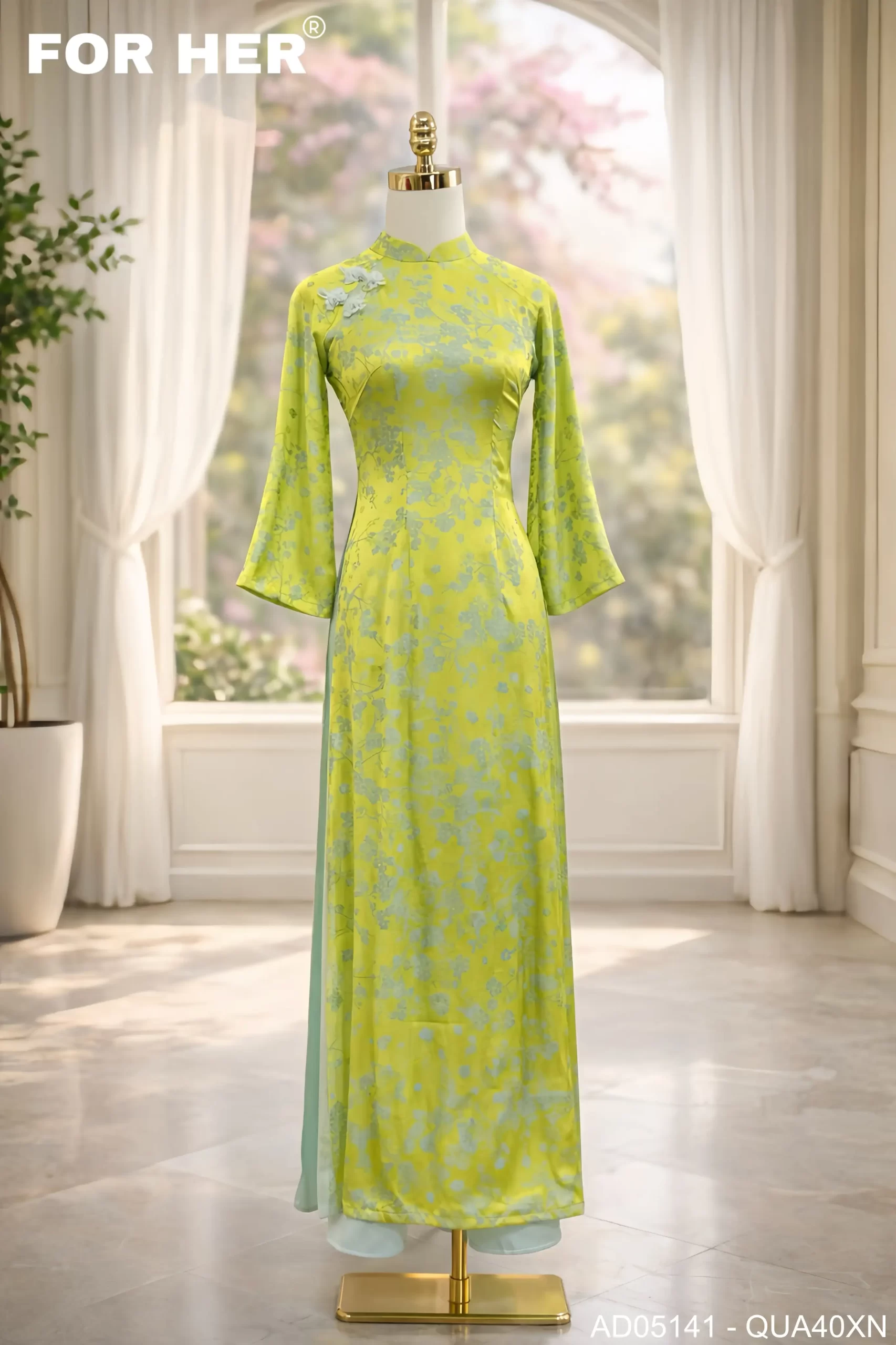 Áo dài Diễm Xuân hoa đào xanh mạ AD05141