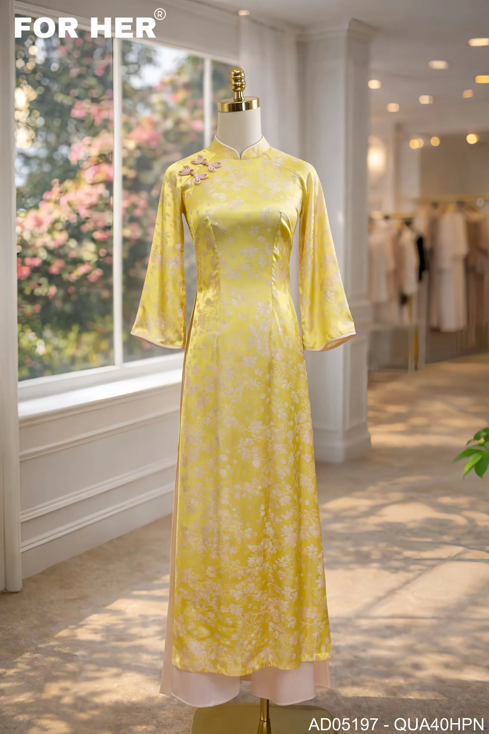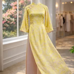 – Áo dài Mộc Tâm hoa đào vàng AD05197 (Chỉ bao gồm áo, không kèm quần)