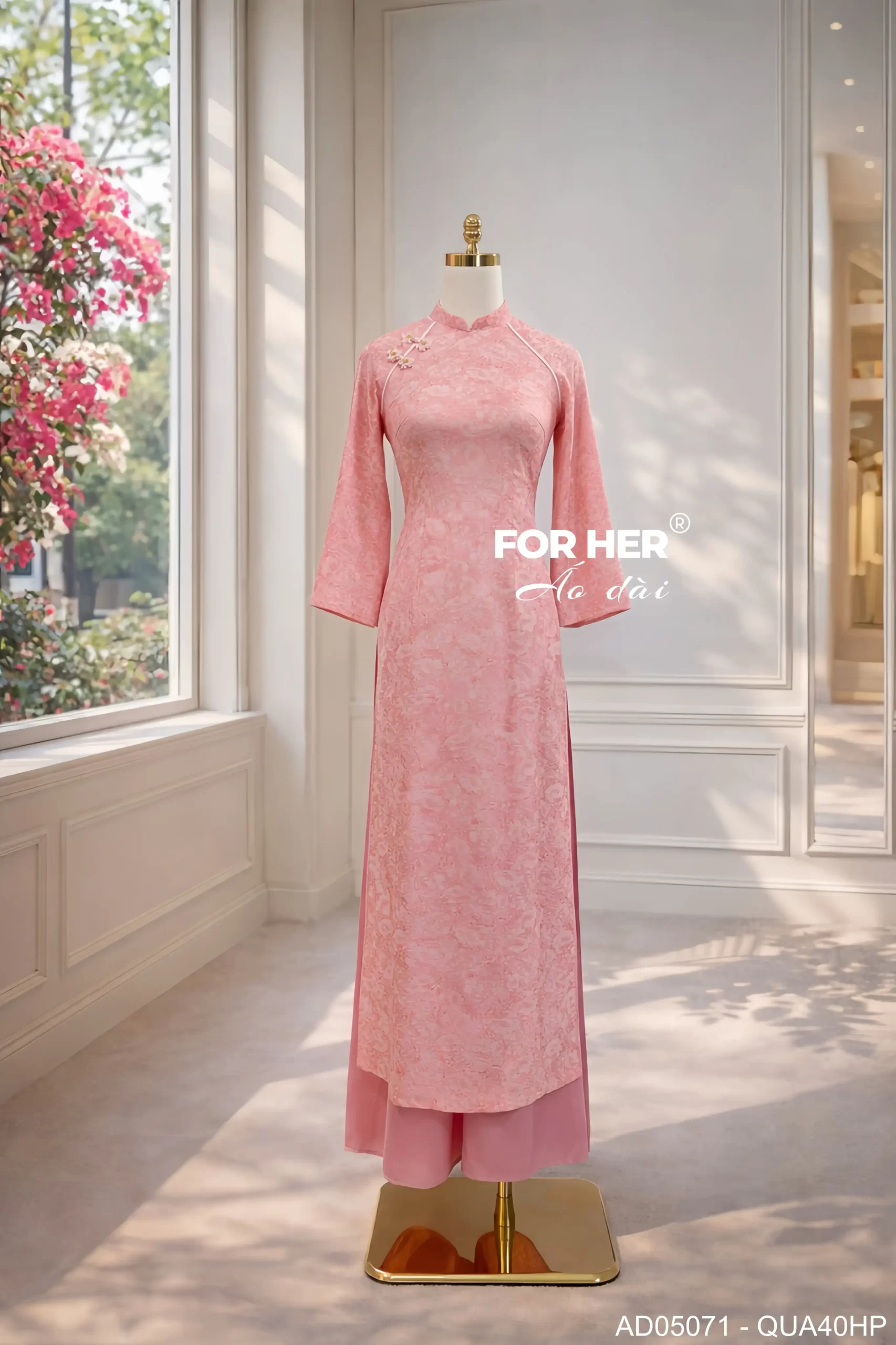 Áo dài Vân An hoa mẫu đơn nút hồng AD05071
